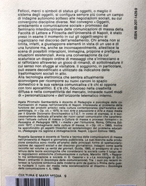 Soggetti: Scienze sociali, Arte, Arredamento, Fenomenologia, Interni, Design, Contesti di arredo, Cultura, Società, Sociologia, Aspetti sociali, Status, Feticcio, Oggettistica, Merce, Segni, Case, Abitazioni, Obsolescenza, Esposizione, Ambiente, Habitat, Trasformazioni, Cambiamenti, Spazio domestico, Ammobiliare, Mondo narrativo, Fruizione estetica, Arredare, Filosofia, Decodificazione, Simboli, Psicologia, Convegni, Congressi, Atti, Politica, Comunicazione, Studi interdisciplinari, Semiotica, Semiologia, Libri Vintage, Fuori catalogo, Pedagogia degli ambienti educativi, Social aspects, Congresses, Mass media, Communication, Aspetti semiotici, Saggi, Culture de masse, Médias, Aspect social, Italian Style, Cottage, Le dehors e de dedans, Social Sciences, Furniture, Phenomenology, Interiors, Furniture, Culture, Society, Sociology, Social Issues, Fetish, Objects, Goods, Signs, Houses, Obsolescence, Exposure, Environment, Transformations, Changes, Home Space, Furnishings, World Narrative, Cosmetic fruition, Furnishing, Philosophy, Decoding, Symbols, Psychology, Conventions, Acts, Politics, Communication, Interdisciplinary studies, Semiotics, Semiology, Out of print books, Pedagogy of educational environments, Communication, Semiotic aspects, Essays, Aesthetics