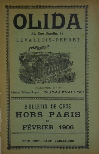 Tarif Olida 1906. Plaquette grand in/8 brochée, couverture illustrée, 31 p., quelques illustrations en noir.