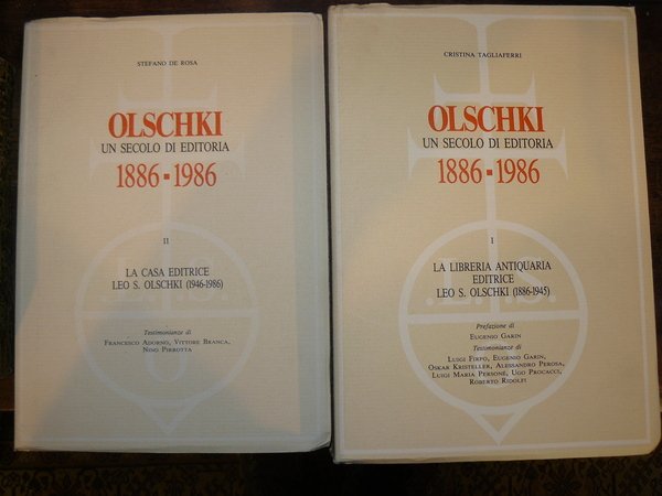 Olschki un secolo di editoria 1886-1986. Vol I: La libreria antiquaria editrice(1886-1945); Vol II: la casa editric Leo S. Olschki (1946-1986). Prefazione di Eugenio Garin. Testimonianze di Firpo, Garin, Kristeller, Perosa, Personé, Procacci, Ridolfi, Adorno, Branca, Pirrotta.