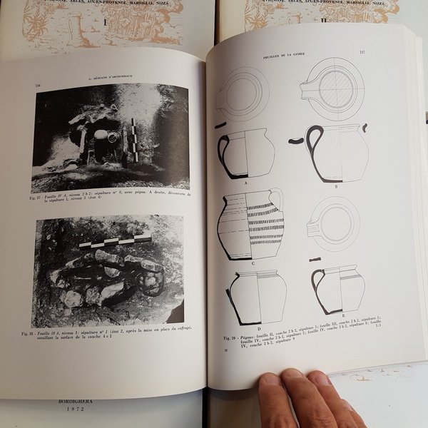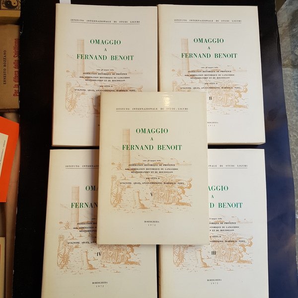 5 voll. in-8°, pp. 360, 386, 316, 330, 229, 11 carte geogr., piantine e planimetrie ripiegate f.t., di cui alcune a colori., brossure editoriali con sovracc. L'Istituto Internazionale di Studi Liguri avendo ricevuto da Benoit ispirazione, sostegno e guida scientifica, ha dedicato alla sua memoria e alla sua opera le annate 1967- 68- 69- 70- 71 della 'Rivista di studi liguri', con l'apporto solidale degli storici e degli archeologi più legati alla Provenza e al Mediterraneo; alla vita e alle opere di Benoit sono dedicati i primi 4 dei 78 saggi contenuti nei 5 voll., gli altri saggi trattano di scoperte archeologiche e di studio dei reperti in Provenza, Alpi Marittime, Linguadoca, Liguria ma non solo, anche zone della Spagna, della Sardegna e della Sicilia; centinaia di disegni, schemi, piantine, c. geogr., fotografie di oggetti, monumenti, statue e scavi archeologici. Ottimo esemplare.