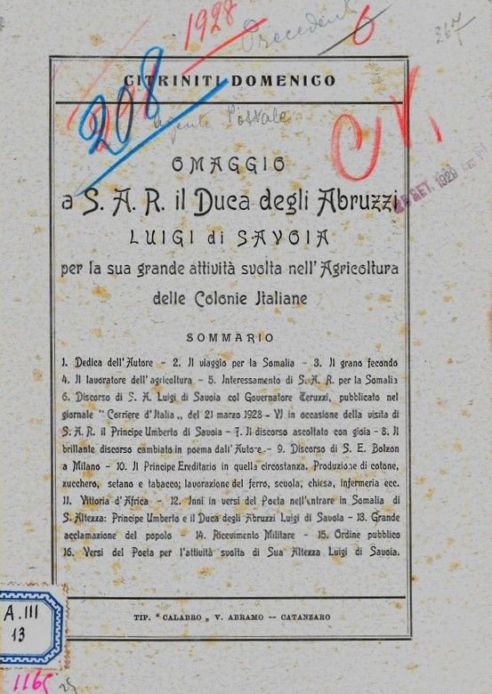 Omaggio a S.A.R. il Duca degli Abruzzi Luigi di Savoia per la dsua grande attività svolta nell'agricoltura delle Colonie Italiane. (Omaggio in versi).