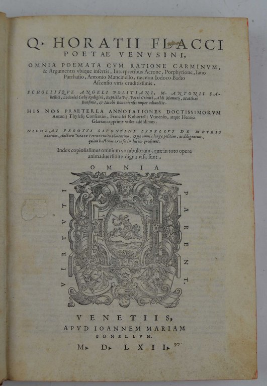 Omnia poemata cum ratione carminum, interpretibus Acrone, Porphyrione, Parrasio, Mancinello, Badio. scholiisque Angeli Politiani, Sabellici, Caelii. Annotationes Thylesii, Robertelli, Glareani. Nicolai Perotti, libellus de metris.vita auctoris ex Petro Crinito florentino.