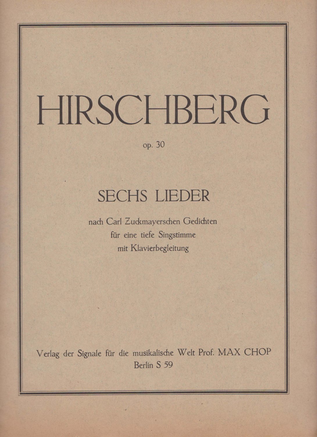 Op. 30. Sechs Lieder nach Carl Zuckmayerschen Gedichten für eine tiefe Singstimme mit Klavierbegleitung. | Libri antichi e moderni | Hirschberg, Walther
