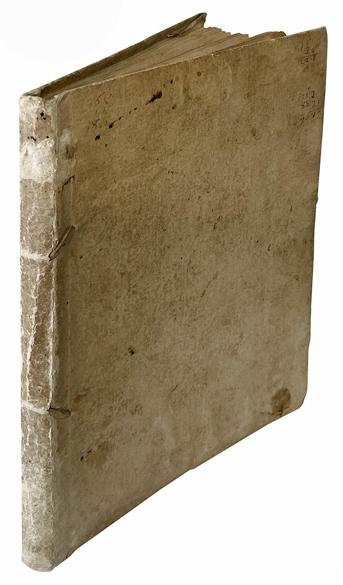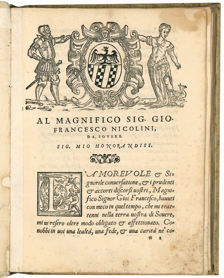 Un volume di due in 4to (mm 197x144); cc. [4], 55, [1]. Segnatura: [fiore]4 A-N4 O2. Manca il libro secondo. Marca editoriale xilografica al frontespizio, bella testatina figurata con lo stemma della famiglia Nicolini di Sovere. Iniziali e frontalini xilografici, numerose vignette con figure geometriche e diagrammi, tre tavole a doppia pagina incluse nella numerazione delle pagine. Frontespizio un po' sporco e con minime mancanze marginali restaurate; rinforzo al margine interno di diverse carte, che tuttavia non interessa il testo. Lievi aloni marginali, lievissime fioriture. Piccoli fori di tarlo al margine superiore interno delle cc. 38-55 in parte restaurati. Alcuni fascicoli un po' sciolti. Cartonato coevo con nervi passanti. Lievi abrasioni al dorso, piccole macchie e calcoli vergati ai piatti. Nota di acquisto al contropiatto del notaio Tommaso Campadelli datata 1790.