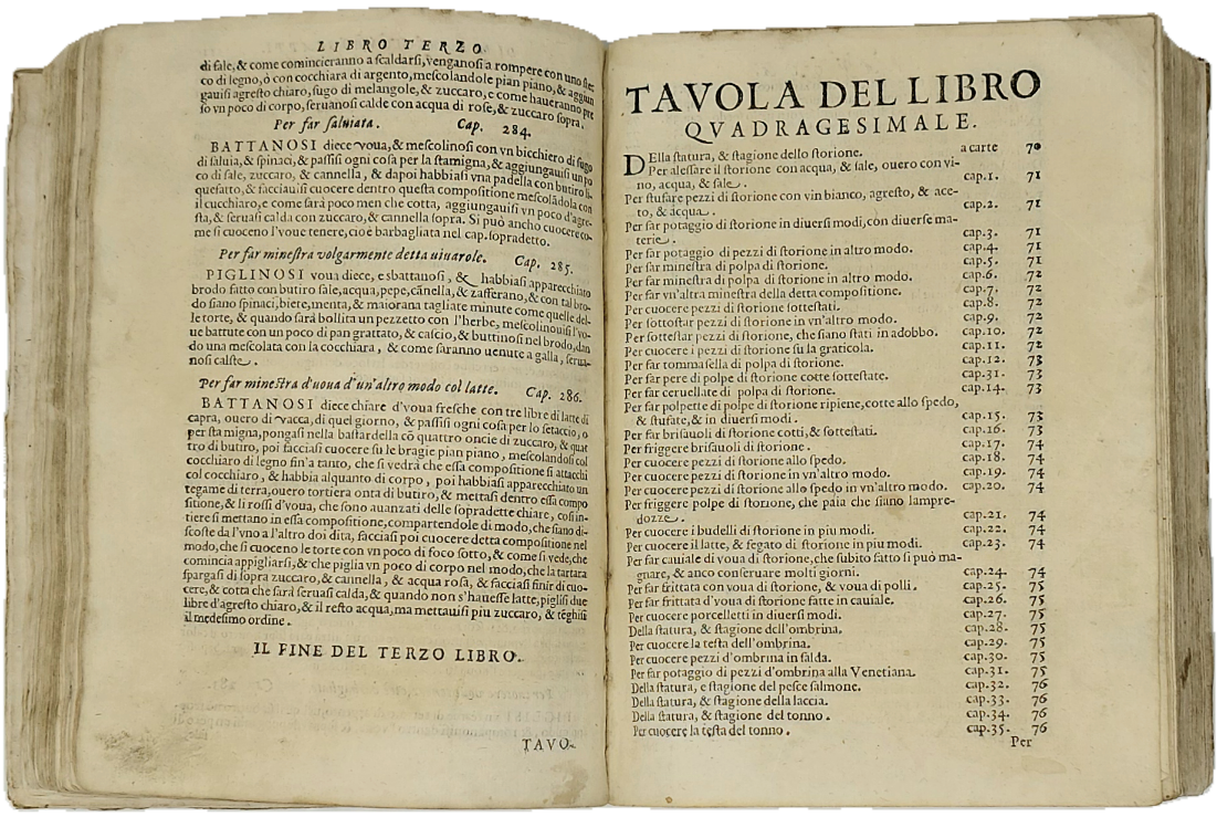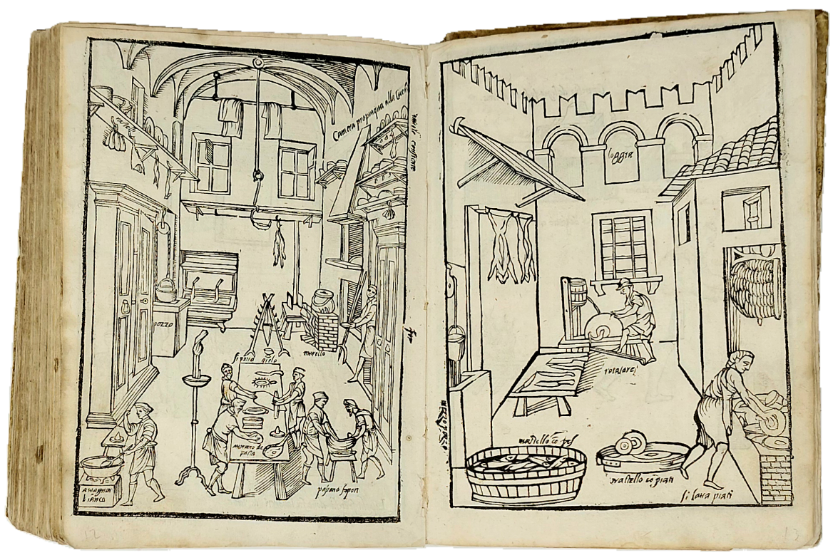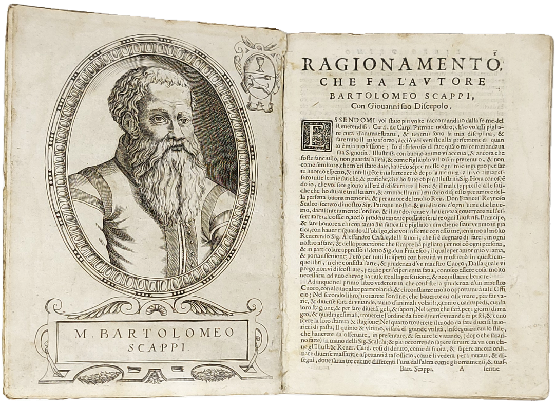 >in-4 (mm 206x150), ff.  (4), 311, (13, ill.), leg. coeva in pergamena floscia. Nei ff. preliminari: privilegio di Pio V, dedica "a Don Franc. di Reinoso scalco e cameriero secreto" e dedica ai Lettori. Stupendamente illustrato con ritratto inciso in rame dell'autore e da 27 artistiche tavole a piena pag. f.t. in silografia (una su doppia pag. delinea con ricchezza di particolari il cerimoniale del servizio di mensa nel Conclave dell'inverno 1549-50): esse offrono una straordinaria documentazione degli arnesi e dei lavori di cucina e rivelano la progredita tecnologia e l'armamentario di una tra le officine gastronomiche principesche del tardo Rinascimento italiano. "Il trattato, ch'è il più ampio e completo fra quanti ne vennero elaborati nel ‘500, ha il carattere di una summa sistematica, frutto di innumerevoli esperienze codificate e filtrate da una rielaborazione unitaria ad opera di un redattore lucido, asciutto, efficiente, che usa un linguaggio tecnico altamente specializzato." (Firpo, Gastronomia del Rinascimento). Quinta edizione (prima 1570) di questo celebre classico della letteratura gastronomica italiana, di grande valore anche per la storia del costume e della tecnologia. Opera rara a trovarsi in buono stato e integra di tavole. Bell'esemplare, puro, grande di margini. Lievissimi aloni e arrossamenti della carta. Westbury, p.202. Vicaire, 773. BING 1781. Bitting 419. Oberlè cita solo le edizioni del 1605 e 1610.
