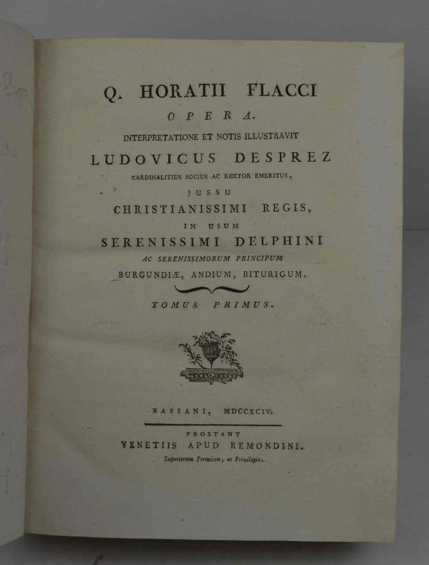 Due volumi legati in uno di cm. 24,5, pp. (8) 760 complessive. Leg. posteriore (1900 ca.) in mezza pergamena con punte, dorso liscio con fregi in oro e titoli su tassello. Esemplare ben conservato. Edizione ad usum Delphini.