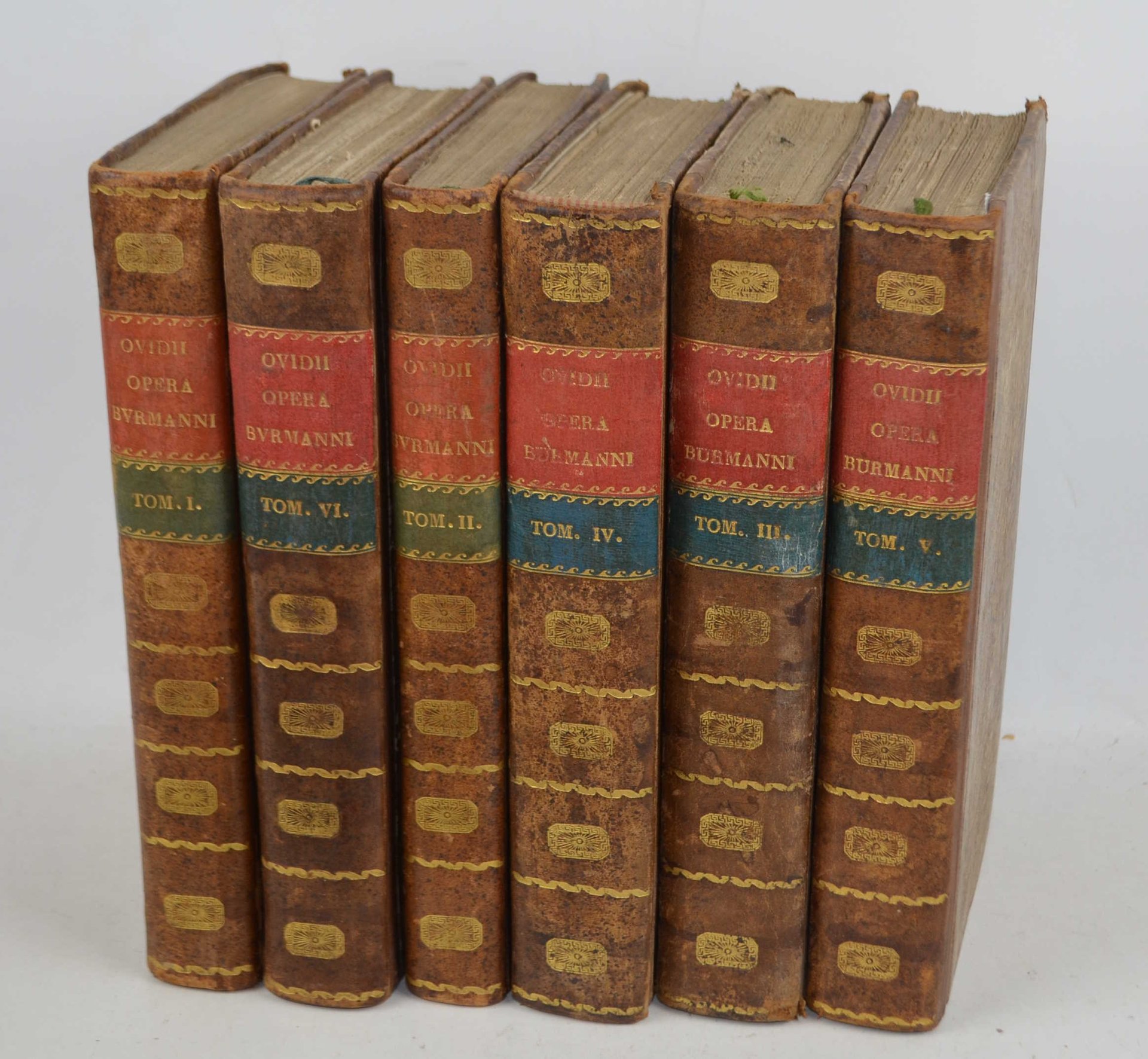 Sei volumi di cm. 24, pp. 3000 ca. complessive. Ritratto di Ovidio all'antiporta del primo volume. Solida ed elegante legatura coeva in mezza pelle con punte, dorsi lisci con fregi in oro e titoli su tasselli bicolore. Esemplare genuino e marginoso, in ottimo stato di conservazione. Bell'edizione di quest'opera che presenta il testo latino originale ed un ampio commento. Sono presenti (come spesso accade) i soli primi sei volumi. Gli ultimi due furono pubblicati solo nel 1827.