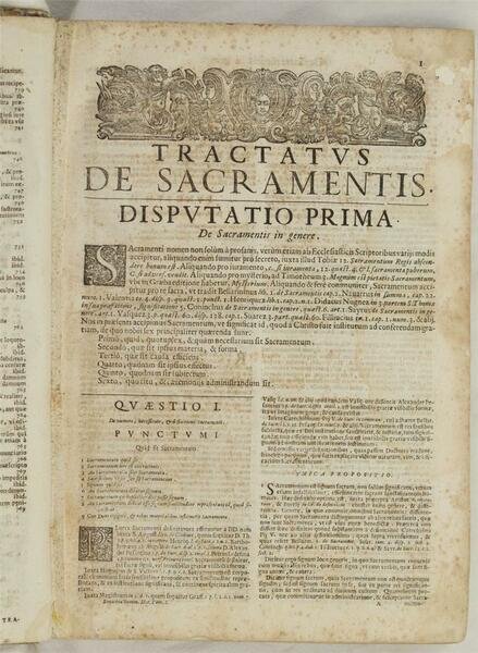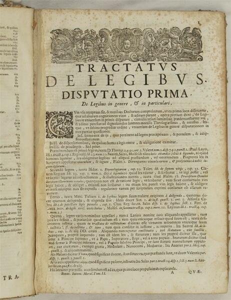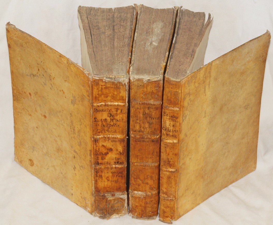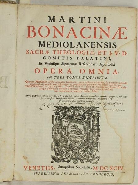 In 4. Dim. 33,5x23,5 cm. Pp. (20)+771+(76), (8)+697+(59), (16)+380+(28). Peso Kg. 5,600. Bella edizione del 1694 di questa Opera omnia del celebre giurista milanese e teologo Martino Bonacina (1585-1631). Bonacina insegnò diritto canonico e civile e le sue opere ebbero il compito di divulgare principi e decreti dogmatici emersi dal Concilio di Trento. L'opera è formata da tre tomi ed è completa. All'interno i celebri trattati "De Sacramentis", "De matrimonio", "De censuris" (assoluzione della censura, scomunica, scomunica dalle eresie, sospensione, interdizione, irregolarità casuate dai delitti e omicidi), "De horis canonicis", "De clausura", De Simonia", "Tractatus de legibus, peccatis et praecepti decalogi" (privilegi, dispensazioni, peccati, superstizione, sacrilegio, blasfemia, contratti, fideiussione, pignoramento, feudo, testamenti, successioni), "De censura" (scomuniche, sospensioni, interdizioni). Ampie parti dedicate alle scomuniche e alle censure con relative tabelle. Bellissima legatura in piena pergamena coeva con titolo manoscritto al dorso. Frontespizi in rosso e nero con bella vignetta entro cornice figurata: Minerva con elmo, lancia e scudo cavalca un leone Antiche note manoscritte all'interno. Grandi dimensioni. Colalzionata e risultata completa. Copertina in piena pergamena a cinque nervi con titolo manoscritto al dorso in buone condizioni generali con lievi usure e parti mancanti ai margini e dorso. Legatura in buone condizioni. All'interno le pagine si presentano in buone condizioni con fioriture, qualche gora d'umidità marginale e bruniture. Alcuni strappi: al margine superiore di pag. 181 del tomo secondo con lieve perdita di testo, orizzontale a pag. 301 del tomo terzo con piccola perdita di testo. Piccolo segno di tarlo al margine destro delle prime 14 carte del tomo terzo senza perdita di testo. Beautiful edition of 1694 of this Opera omnia of the famous jurist and theologist from Milan Martino Bonacina (1585-1631). Bonacina teacjed church and civil right and his works had the duty to spread dogmatic principles and decrees from the COuncil of Trento. the work is made up of three tomes and it is complete. Isndie the famous treaties "De Sacramentis", "De matrimonio", "De censuris" (absolution of censorship, scommunication, scommunication of heresies, suspension, interdition, irregularities caused by murders), "De horis canonicis", "De clausura", De Simonia", "Tractatus de legibus, peccatis et praecepti decalogi" (priviledges, dispensations, pities, superstitions, blasphemy, contracts, fideiussione, testaments, successions), "De censura" (scomunications, suspensions, interditions). Wide parts dedicated to scomunications and censorships with charts. Very beautiful full parchment coeval cover with manuscripted title in the spine. REd and black title pages with vignette in figurated frame: Minerva with elm and lanch in a lion. Ancient manuscripted notes inside. Of big size. Collationed complete work. Full parchment coeval cover with five nerfs and manuscripted title in the spine in good general conditions slightly worn with missing parts in the edges and spine. Binding in good conditions. Inside pages are in good conditions with foxings, humidity stains in the edges and yellowings. Some tears: in the upper edge of pag. 181 of second tome with slight loss of text, horizontal tear in pag. 301 of third tome with slight loss of text. Slight worming in the right edge of the first 14 pages of third tome with no loss of text.