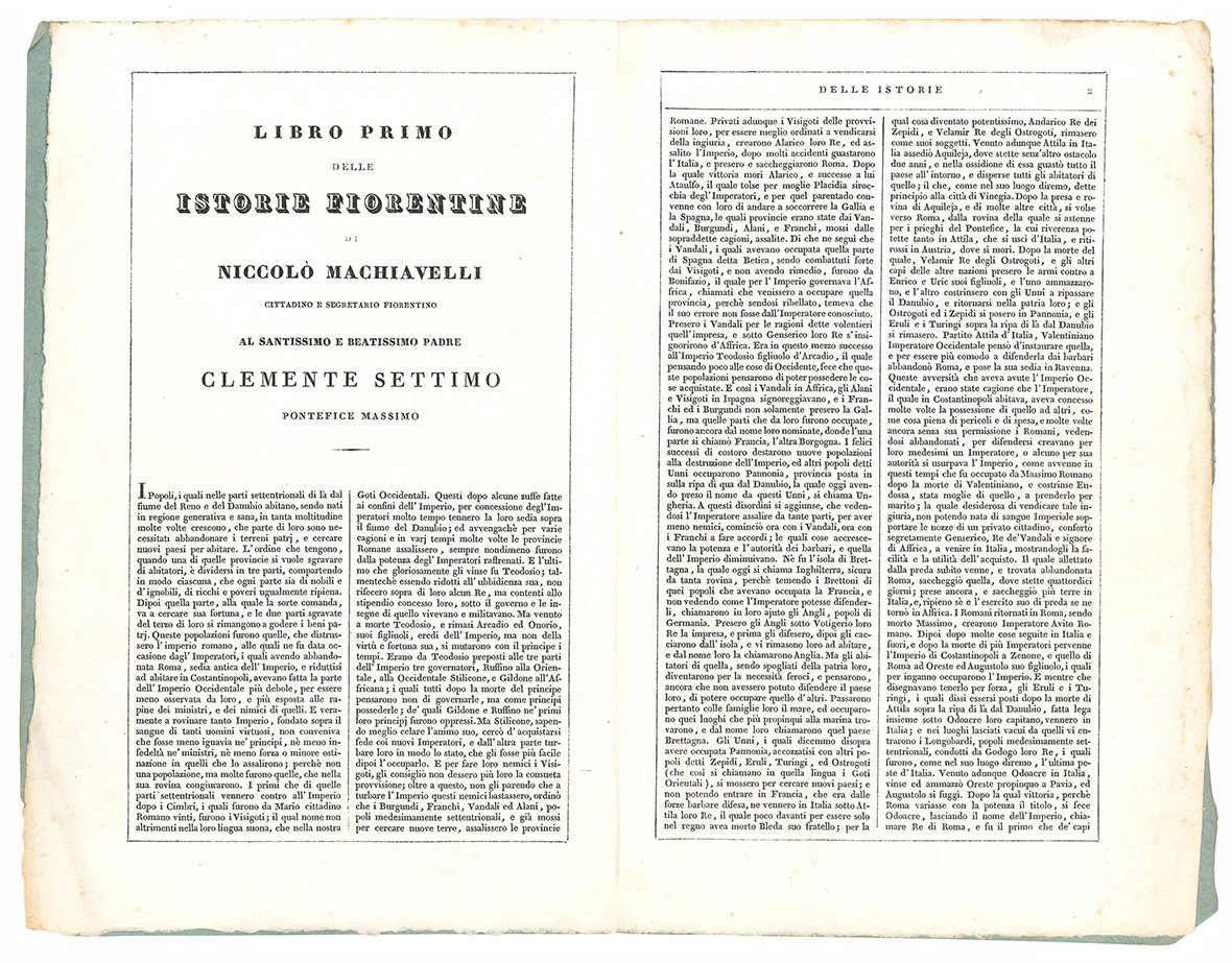 Interessante prospetto editoriale in 8vo (mm 213x138); pp. [4]. Brossura editoriale con vignetta e titolo entro cornice alla copertina anteriore. Il prospetto un estratto del libro primo delle Istorie Fiorentine. Sulla copertina posteriore sono riportate le condizioni di associazione con i prezzi nelle diverse valute d'Italia.