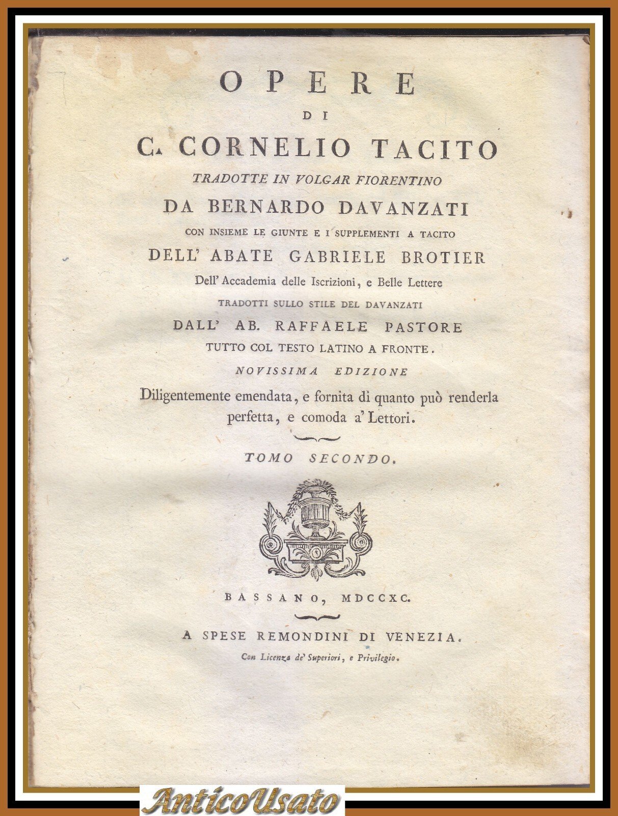 OPERE DI CORNELIO TACITO tomo 2 tradotte da Davanzati 1790 Remondini libro antic