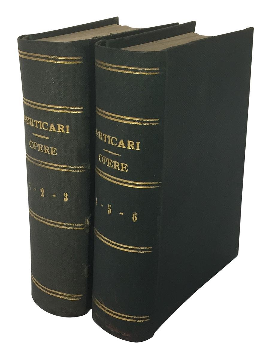 Cinque parti in due volumi in 24mo (mm 125x75); pp. 133, [3], [6] c. di tav. fuori testo; 163, [1]; 157, [3]; 155, [1]; 148. Al termine del Volume V si trova Degli scrittori del Trecento e dei suoi imitatori. Libri due (pp. 184). Ogni parte è dotata di proprio frontespizio. Leggere fioriture diffuse, lievi aloni al margine di alcune carte. Restauro al margine superiore del frontespizio della terza parte. Foro di tarlo che interessa la seconda parte del secondo volume, che alle pp. 175-184 si allarga arrivando ad interessare anche il risguardo e il contropiatto posteriore. Tela editoriale verde con filetti e titolo in oro al dorso.