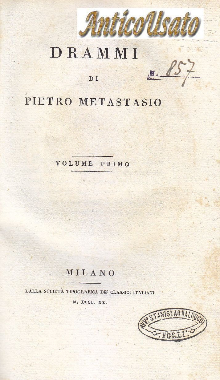 LV + 565 + 642 + 646 + 626 + 617 Pagine incisione del ritratto di Pietro Metastasio in antiporta del volume I Copertine non originali in mezza pergamena Dimensioni: 13,5 x 22 cm Stato di conservazione: molto buono (timbri privati di appartenenza, fioriture, copertine non originali)