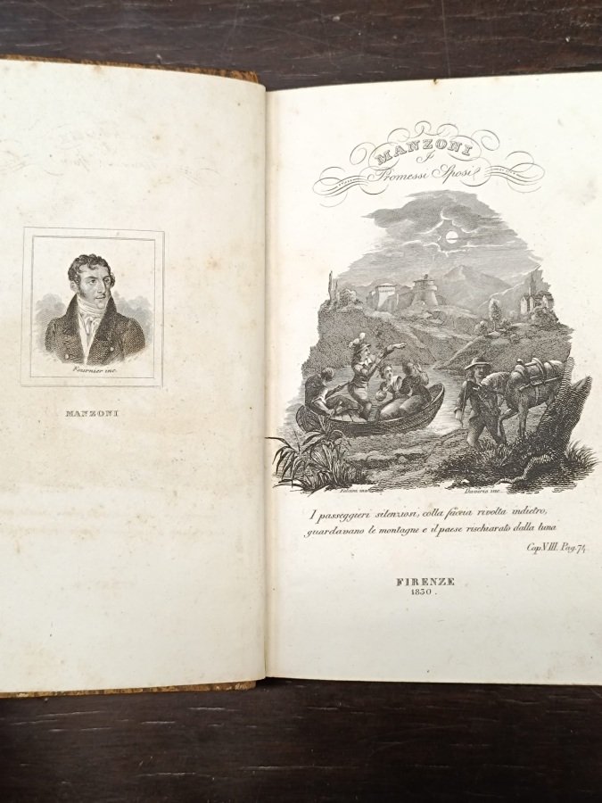 <span style="font-style: normal;">In-16° (cm. 18,4), legatura coeva in mezza pelle bruna, dorso liscio con titolo in oro su tassello verde, filetti e fregi sempre in oro, piatti marmorizzati (lievi tracce d'uso), tagli spruzzati; pp. 500 in buono stato (alcune fioriture); con 1 ritratto del Manzoni inciso in rame dal Fournier all'antiporta fuori testo e 6 graziose vignette disegnate da Falcini e sempre incise in rame su tavole fuori testo. Bella edizione di questo volume che comprende: I Promessi Sposi, Il Carmagnola, L'Adelchi, Il discorso storico sopra la storia longobardica, </span><i>Lettre sur l'unit‚ de temps et de lieu dans la tragedie</i>, In morte di Carlo Imbonati, Urania, Inni Sacri, Il cinque maggio. Cfr. Giujusa 40, Vismara 338, Parenti 70, Salveraglio 4. Esemplare molto buono. (NG3)