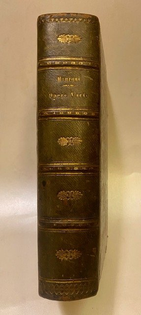 Legatura coeva in mezza pelle, dorso con nervi, titolo e fregi in oro, con 10 splendide illustrazioni xilografiche incise da Ratti sui disegni di Focosi, testatine e capilettera illustrano gli Inni Sacri, testo inquadrato da duplice filetto. Prima edizione curata dal Manzoni delle sue “Opere varie” pensata come ideale completamento della celebre edizione dei Promessi Sposi detta “Quarantana” stampata da Redaelli nel 1840. Include: Adelchi, Discorso sopra alcuni punti della storia longobardica in Italia, Il Conte di Carmagnola, Lettre a M.C. sur l’unité de temps et de lieu dans la tragédie, Del Romanzo storico, e in genere, de’ componimenti misti di storia e d’invenzione, Dell’Invenzione, Sulla lingua italiana, Osservazioni sulla morale cattolica, Inni Sacri, strofe, il Cinque Maggio. Cfr. Vismara, 329.