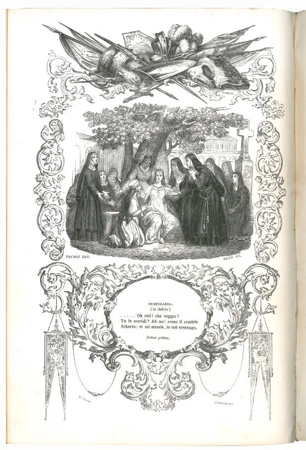 In 4to; mezza pelle, dorso con fregi e titolo in oro; pp. 878. Presenza di lievi fioriture a centro pagina nella sezione 129-157. Esemplare con l'aggiunta della nuova dispensa contenente l'ode "Marzo 1821", il "Proclama di Rimini" e il nuovo indice. Con 10 xilografie n.t. incise da Ratti su disegni di R. Focosi e Fiorentini, 9 vignette e altrettante graziose piccole iniziali incise da Ratti e Salvioni su disegni di P. Riccardi e S. Mazza. Fregio al titolo. Testo incorniciato. Dorso restaurato. Include: Adelchi; Discorso sopra alcuni punti della storia longobardica in Italia; Il conte di Carmagnola; Lettre a M.C. sur l'unité de temps et de lieu dans la tragédie; Del romanzo storico e, in genere, de'componimenti misti di storia e d'invenzione; Dell'invenzione; Sulla lingua Italiana; Osservazioni sulla morale Cattolica; Inni sacri; Strofe; Il cinque Maggio. Parenti, Rarità bibliografiche '800, pp. 230 - 246; Vismara, 329.