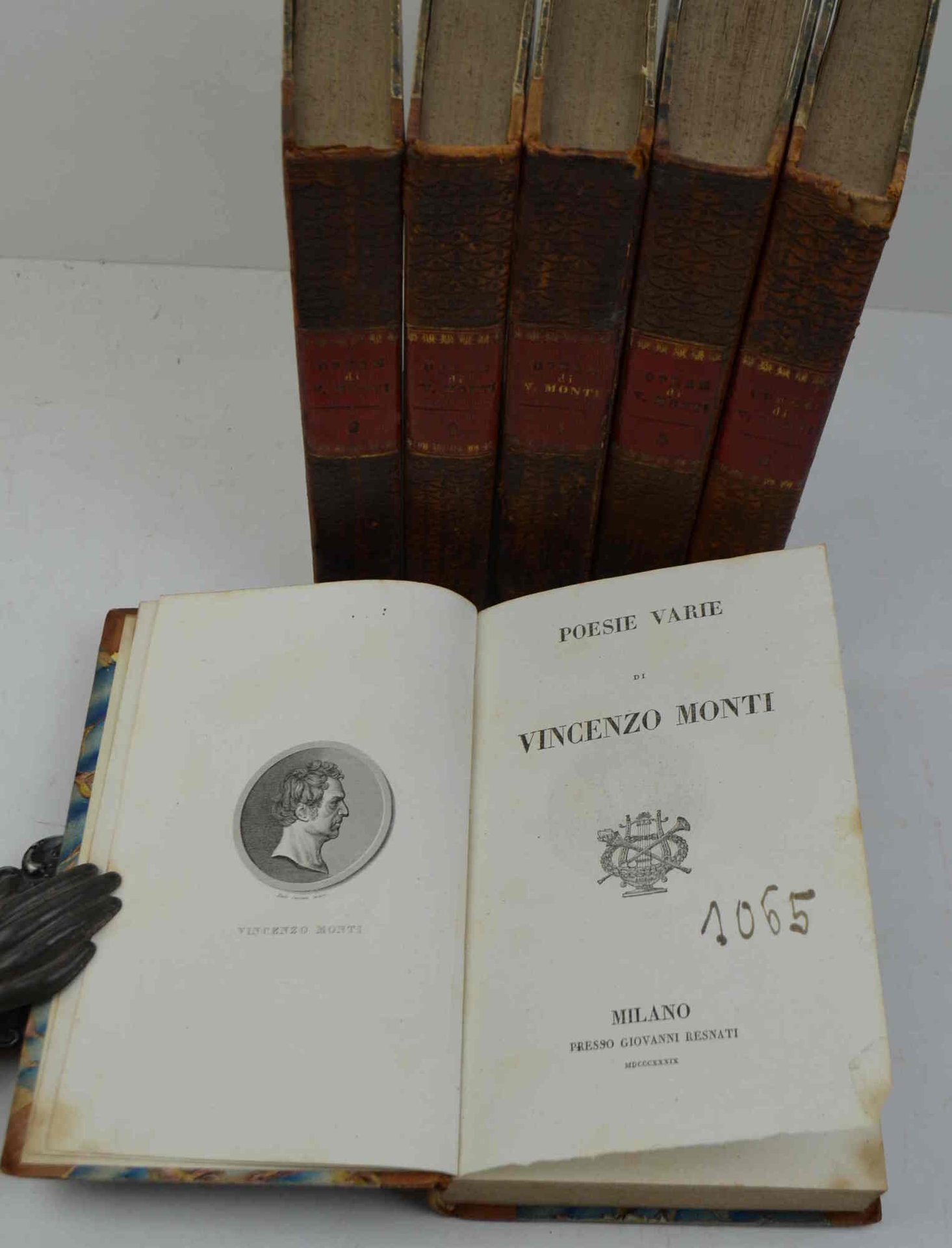 Sei volumi di cm. 19, pp. 3.500 ca. complessive. Con ritratto inciso all'antiporta del primo volume e una tavola ripiegata riproducente una lettera del Monti. Legatura del tempo in mezza pelle, dorsi lisci con fregi a secco e titoli in oro su tassello. Qualche traccia d'uso ai dorsi, peraltro esemplare ben conservato.
