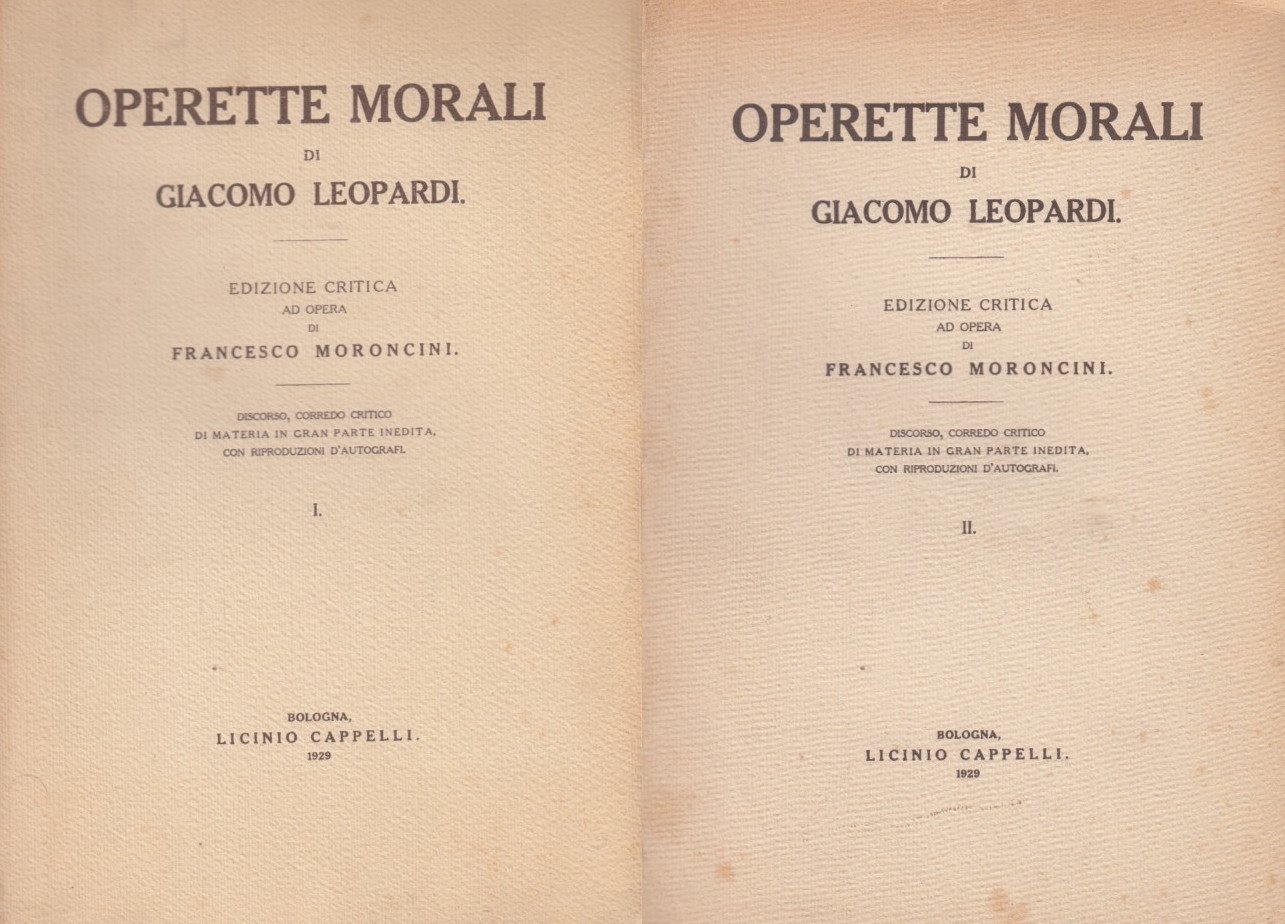 Leopardi Giacomo: Operette morali. Edizione critica ad opera di Francesco Moroncini, discorso, corredo critico di materia di gran parte inedita con riproduzioni d'autografi. Bologna, Licinio Cappelli, 1929