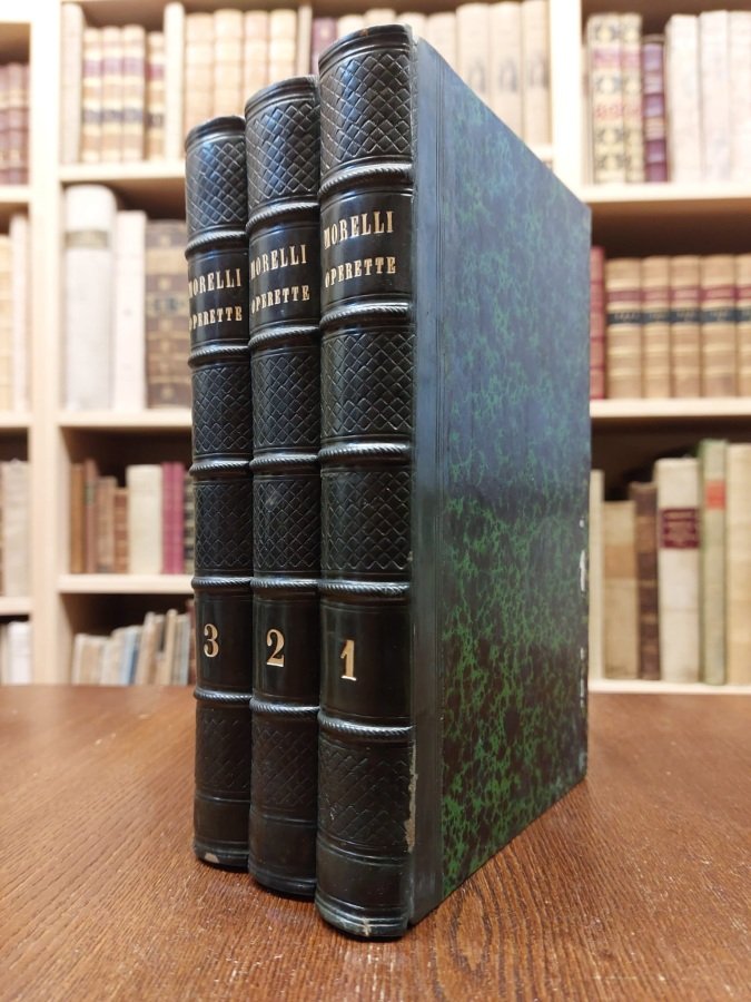 3 volumi in-8° (cm. 22), belle legature coeve in m. pelle, titolo in oro ai dorsi con nervi e decorazioni a secco, piatti e risguardi marmorizzati; pp. [10] CXIII [7], 416, 410 [2] in buono stato e con 1 tavola di ritratto dell'autore f.t.; appunti bibliografici di mano coeva ai risguardi (che lasciano alcuni segni alla prima e ultima carta di ciascun tomo), lievissime fioriture sparse, arrossamento all'angolo di alcune carte del terzo tomo. Prima edizione di questa raccolta del bibliotecario della Marciana, edita dal Gamba, che si apre con una bio-bibliografia dell'autore stilata da Moschini. (SC2)