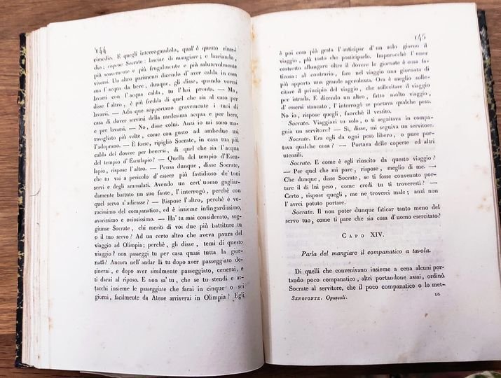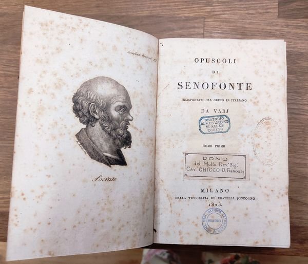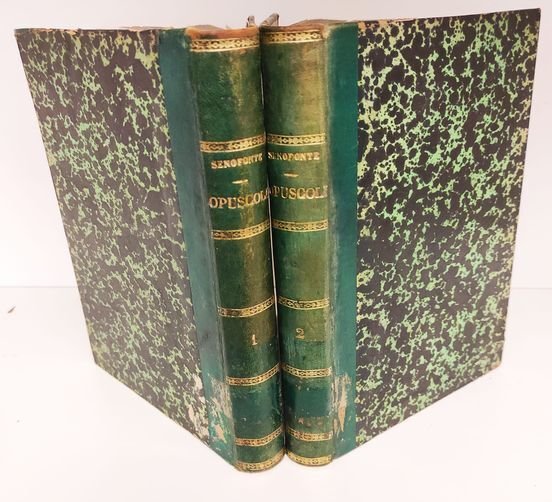 2 volumi in 8, Tomo 1: 9, [1], 325, [5], 329-259 [i.e. 360, 3] p., [2] carte di tav. : ill. calcogr., 1 ritratto. Contiene: Dei detti memorabili di Socrate. Apologia ossia la difesa di Socrate ai giudici. Traduzione di M. A. Giacomelli. Il Convito di Senofonte tradotto dal greco e con note illustrato dal cavaliere Sebastiano Ciampi. Ierone ovvero la vita del tiranno traduzione di Marcantonio Gandini. 2: XIX, [1], 370, [2] p., [2] carte di tav. ripieg. : ill. calcogr. Contiene: Orazione in lode del re Agesilao; Repubblica di Lacedemone; Repubblica di Atene; Delle finanze d'Atene e de' verj mezzi di accrescerle; L'economo di Senofonte; Il Cinegitico ossia intorno alla caccia; Del carico del generale di cavalleria; Dell'arte di cavalcare; Epistole. Legatura in mezzo pelle come da foto. Libri provenienti da biblioteca con i consueti timbri e sigle, volumi dismessi. Fioritura soprattutto alle prime ed ultime carte. Buono (Good) .