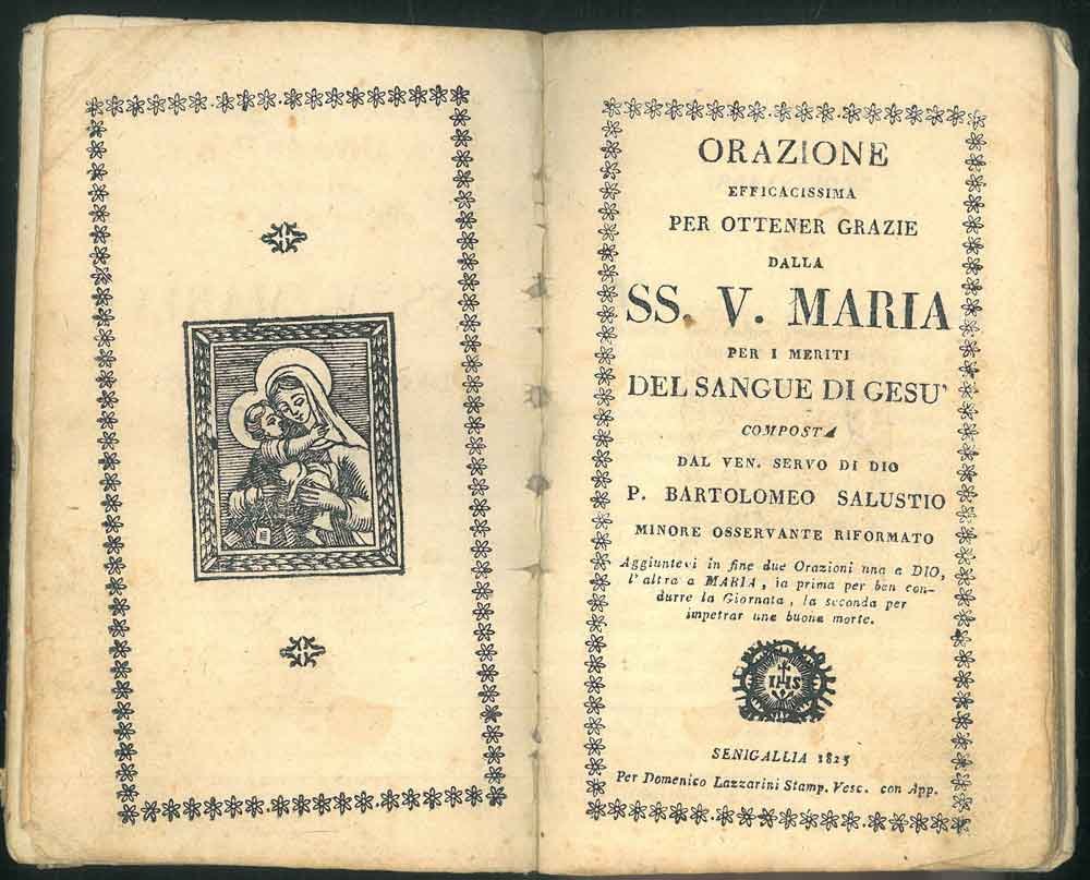 Orazione efficacissima per ottener grazie dalla SS. V. Maria per i meriti del sangue di Gesù. Aggiuntevi in fine due orazioni, una a Dio, l'altra a Maria, la prima per ben condurre la giornata, la seconda per impetrar una buona morte.