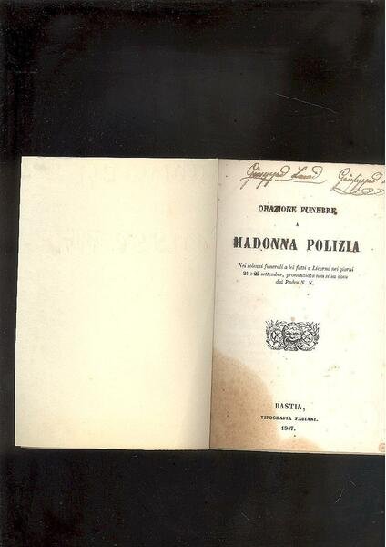 IN 16°, pp.11, COPERTINA MARMORIZZATA MUTA. LA PLACCHETTA, E UNA ORAZIONE SATIRICA SUI FUNERALI FATTI A MADONNA POLIZIA A LIVORNO, IL 21 22 SETTEMBRE 1847. INTERESSANTE PUBBLICAZIONE SIA PER IL CONTENUTO SATIRICO RISORGIMENTALE, SIA PER LO STAMPATORE. ALCUNI LIBRI CON INDICAZIONE DI STAMPA BASTIA, POSSONO ESSERE STATI STAMPATI ALLA MACCHIA, IN CORSICA O CON FALSA DATA A LIVORNO. TRA IL 1820 E IL 1849 I FABIANI STAMPARONO MOLTO SUL CLIMA LEGATO AL RISORGIMENTO ITALIANO. GIOVANNI FABIANI COMINCIA A STAMPARE NEL 1821, DOPO AVER COMPRATO I TORCHI DI STEFANO BATINI. PLACCHETTA CATALOGATA NELLA BIBLIOGRAFIA DEL RISORGIMENTO DI INTERESSE LIVORNESE, A CURA DI MARIA LIA PAPI. GORA MARGINALE CHE INTERESSA QUASI TUTTE LE pp. NELLA PARTE BIANCA IN BASSO A SINISTRA MA CHE NON TOCCA IL TESTO. NELLA PARTE ALTA DEL FRONTESPIZIO, DUE ANTICHE FIRME.<BR>RARA. ID, 6746