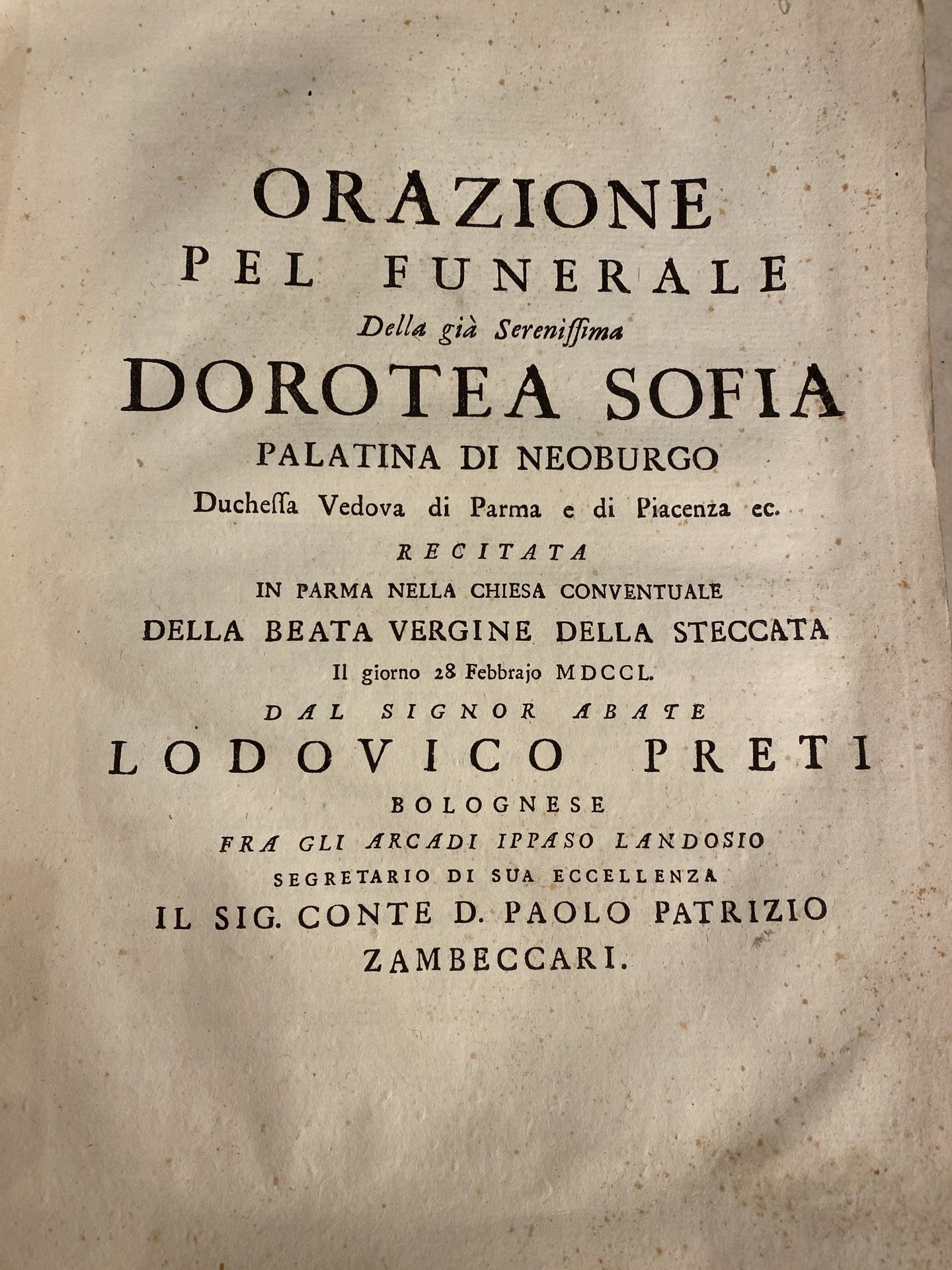 Orazione pel funerale della già serenissima Dorotea Sofia Palatina di Neoburgo duchessa vedova di Parma e di Piacenza recitata in Parma nella chiesa conventuale della Beata Vergine della Steccata il giorno 28 febbraio MDCCL dal signor abate Lodovico Preti