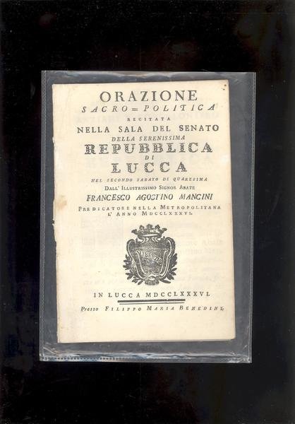 IN 16° ( cm.19 X 13 ), pp. XVI.BELLO STEMMA DELLA REPUBBLICA DI LUCCA AL FRONTESPIZIO + DUE CAPILETTERA E UNA TESTATINA . IL TUTTO INCISO. ORAZIONE RECITATA NEL SECONDO SABATO DI QUARESIMA DALL'ILLUSTRISSIMO SIGNOR ABATE FRANCESCO AGOSTINI MANCINI PREDICATORE NELLA METROPOLITANA L'ANNO MDCCLXXXVI.<BR>PLACCHETTA SENZA COPERTINA. OTTIMA CONSERVAZIONE.ID 1169