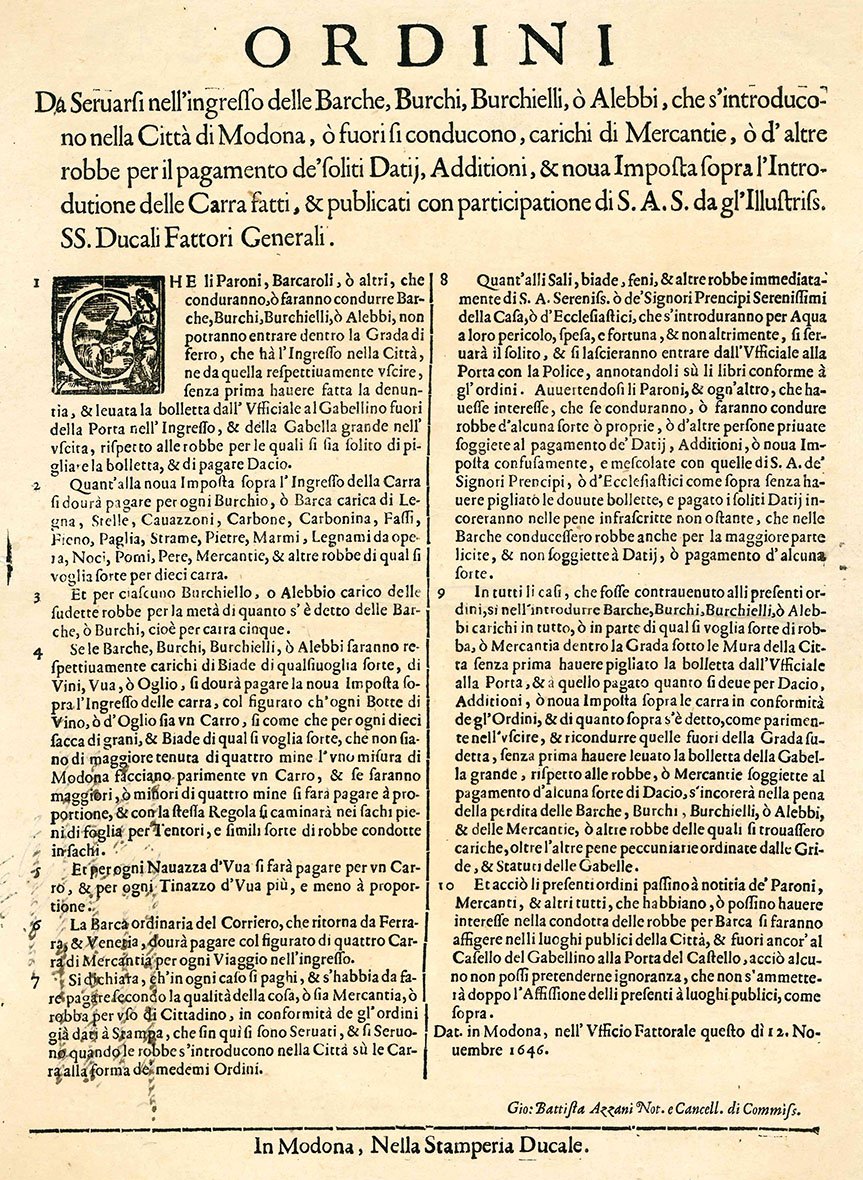 Ordini da Servarsi nell'ingresso delle Barche, Burchielli, ò Alebbi, che s'introducono nella Città di Modona, ò fuori si conducono, carichi di Mercantie, ò d'altre robbe per il pagamento de' soliti Datij, Additioni, & noua Imposta sopra l'Introdutione delle Carra fatti, & publicati con partecipazione di S.A.S. da gl'Illustriss. SS. Ducali Fattori Generali