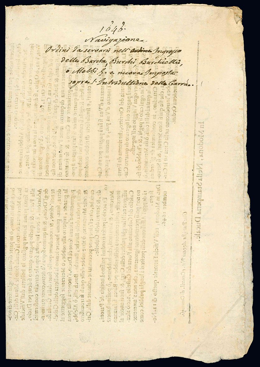 Foglio volante (mm 421x309), col quale si imponeva il pagamento di un dazio per le imbarcazioni che fossero entrate o uscite dalla città di Modena, e di una nuova imposta per l'introduzione “delle Carra” in città. Capolettera inciso, testo su due colonne. Al verso note manoscritte che spiegano il contenuto del documento.