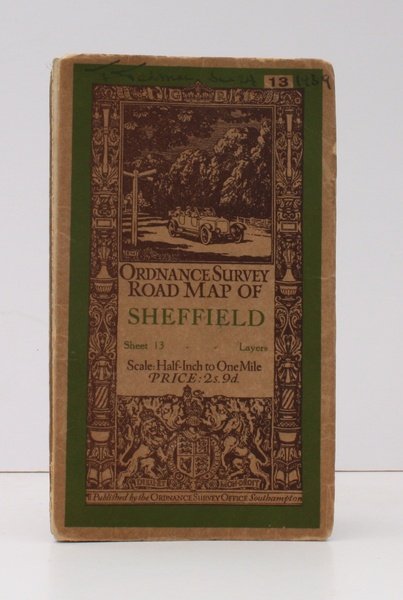 Folding coloured map on cloth measuring 22 x 30 ins (approx. 55.5 x 76.0 cms) folding in 21 panels to 7.5 x 4.25 ins (approx. 19.0 x 11.0 cms); original pictorial card wrappers, neat contemporary signature on front wrapper, wrappers lightly age-soiled else a very good, bright, clean copy. With the trade ticket of Moyse of Sheffield on rear wrapper. The Half Inch series was first published in 1919 with striking 'motorist' artwork by Ellis Martin. The present copy is the 1939 revision; the covers are the green and brown variant with green sheet name. Browne, 12.2.a