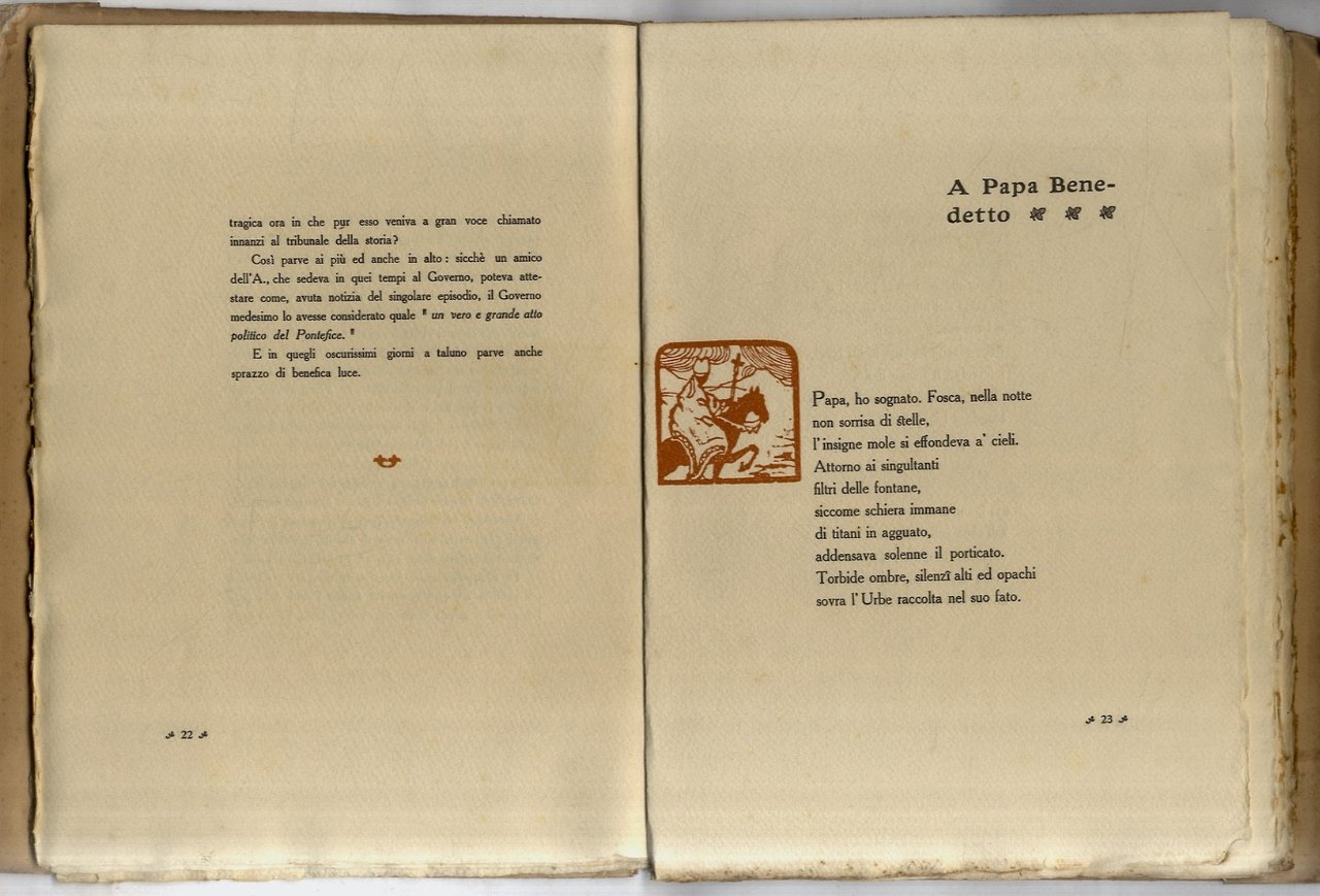Firenze, Bemporad & Figlio, (1926), in-8 grande, brossura editoriale illustrata, pp. 75, (7). Con iniziali e decorazioni xilografiche. Prima edizione. Uniamo un opuscolo di 4 pp. di giudizi critici sull'opera, stampato sempre da Bemporad. Ottime condizioni: volume intonso.