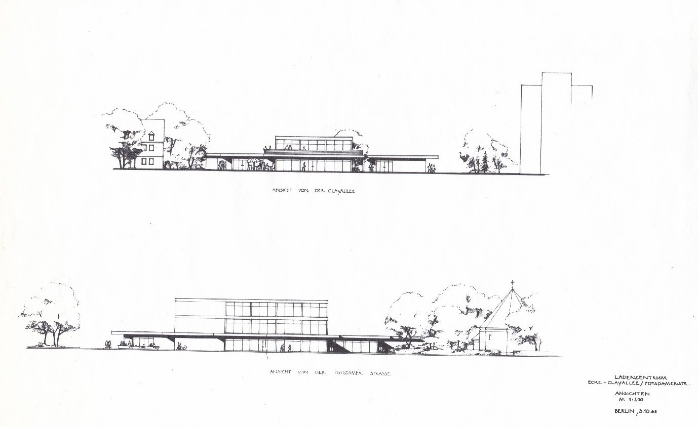 Original-Architektenentwürfe zu dem Bauprojekt: Ladenzentrum Ecke Clayallee/Potsdamer Straße in Berlin-Zehlendorf.