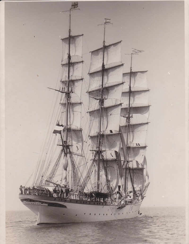 Original-Photographie der "Schulschiff Deutschland". Beschriftung auf der Rückseite: Schulschiff Deutschland Reserve / Pfingsten 1932 / Travemünder-Ferienzeit. Der Herausgeber war wohl der Deutsche Schulschiff-Verein.