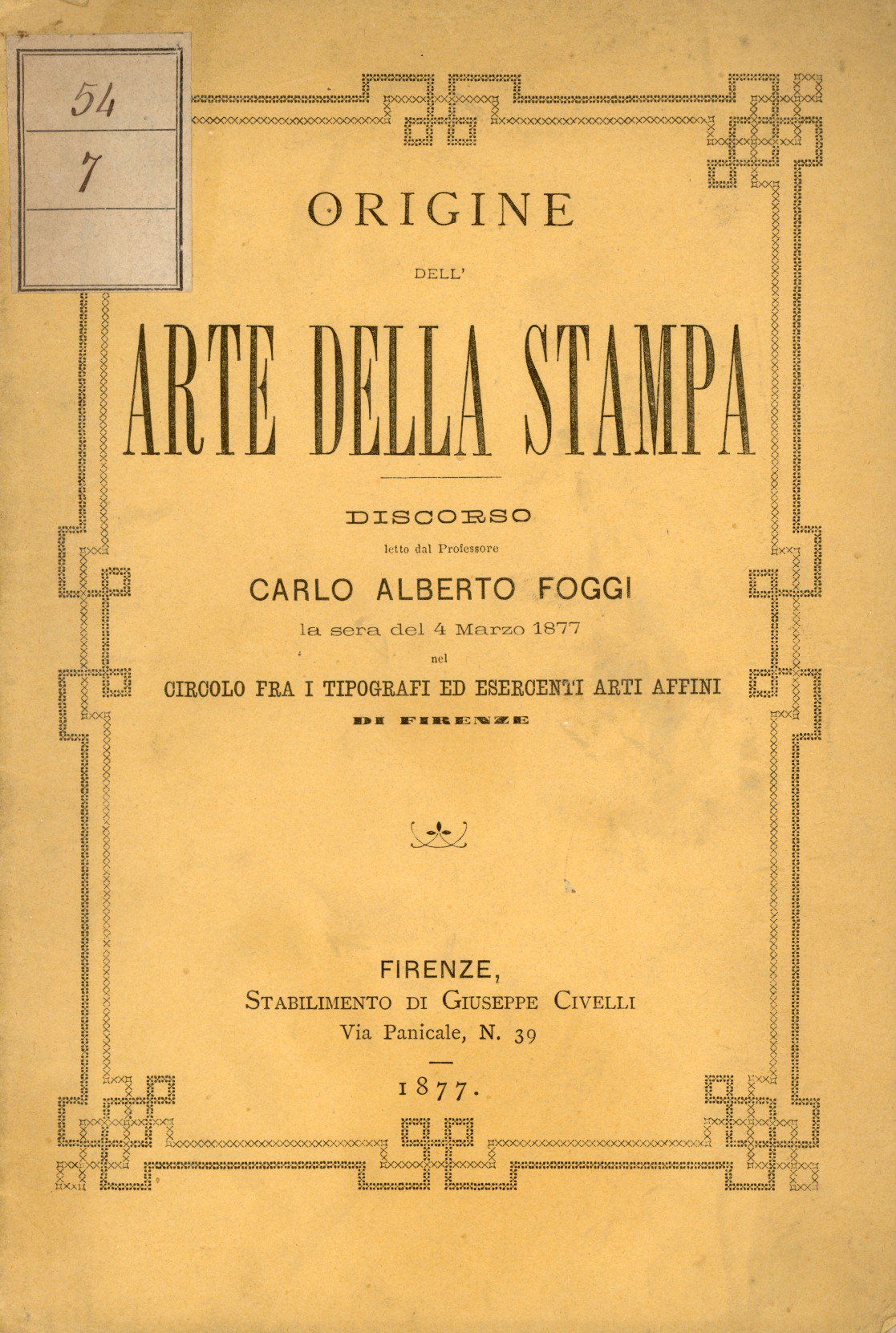 Discorso letto la sera del 4 marzo 1877 nel Circolo fra i tipografi ed esercenti arti affini di Firenze. 1 ill. in nero f.t. 010 � Ba In Ottavi (15-23cm ) Buono (Good) Buono