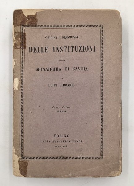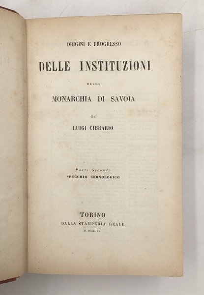 ORIGINI e PROGRESSO delle INSTITUZIONI della MONARCHIA di SAVOIA. Parte prima. STORIA - Parte seconda. SPECCHIO CRONOLOGICO.