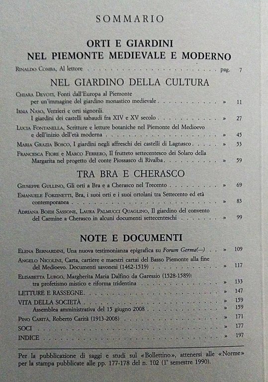 ORTI E GIARDINI NEL PIEMONTE MEDIEVALE E MODERNO. Atti del Convegno, Cherasco, 10 maggio 2003. A cura di Rinaldo Comba e Giuseppe Gullino. Bollettino della Società per gli Studi Storici, Archeologici ed Artistici della Provincia di Cuneo, N. 138, 1° semeste 2008.