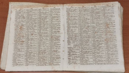 393 pagine, testo su 4 colonne. copertina in tutta pergamena con titolo manoscritto al dorso. stato di conservazione: buono (copertina sciupata e in parte staccata dal volume, con strappi e piccole mancanze, fioriture, legatura allentata, piegoline alle ultime pagine)