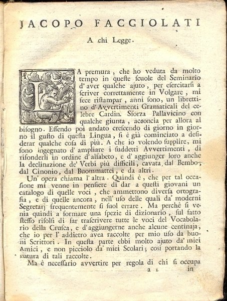 Ortografia moderna italiana per uso del seminario di Padova. Nuovamente accresciuta di voci e ricorretta con: I Avvertimenti Grammaticali. II Avvertimanti per le lettere Familiari. III Vocabolario domestico. IV Alcune Lettere di Francesco Redi in proposito di lingua.