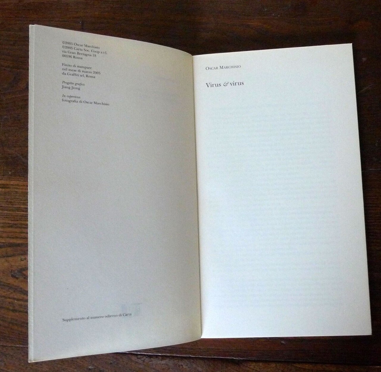 Oscar Marchisio,VIRUS & VIRUS.Carta, Roma 2005,supplemento al numero odierno di Carta,brossura, 24,5x14,5 cm., pp.95,CARTOGRAFIE n.1Collezione di varia letteraturacon pubblicazioni saltuarie,peso: g.200