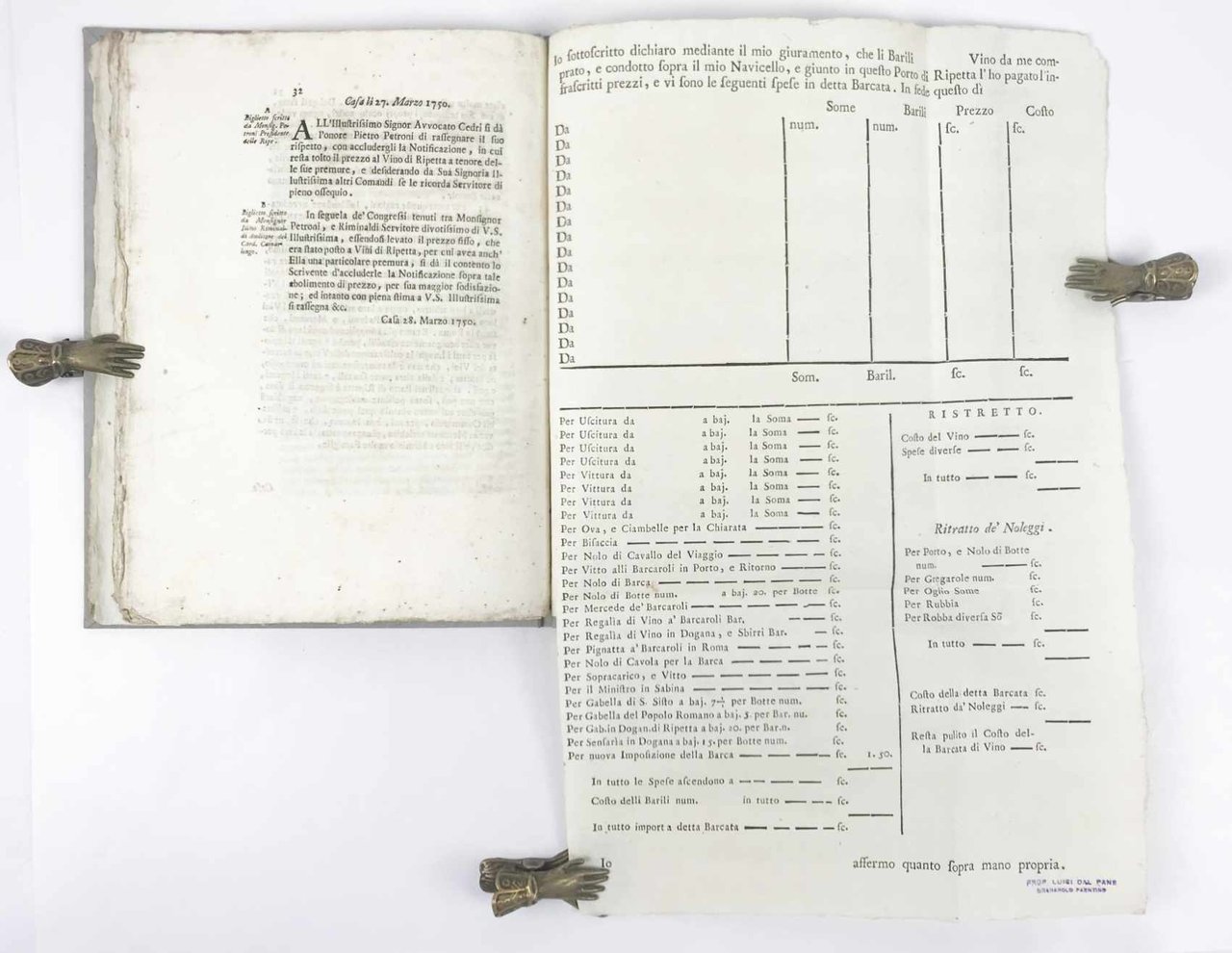 - pp. 32; in fine un foglio ripiegato con il modulo da compilare per chi trasporta vino al porto di Ripetta, con l’obbligo sotto giuramento di dichiarare numero di barili, costo del vino, ecc.