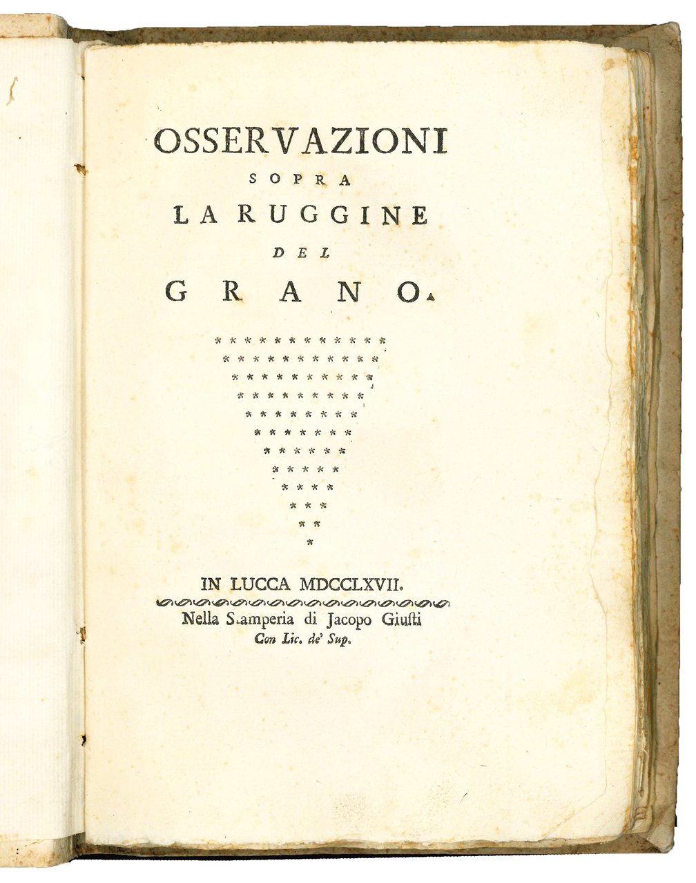 First edition of this important text on phytopathology, in which the author demonstrated that the disease that afflicted the wheat in the Tuscan countryside in those years, covering it with a rust-colored powder, was actually due to a parasitic plant, the Puccinia graminis, of which he provided an accurate morphological description. The work thus represents one of the earliest examples of microscopic investigation conducted for social purposes. Also, the colored illustrations showing Puccinia graminis and Uredo, are pioneering for the time (P.A. Saccardo, La Botanica in Italia. Materiali per la storia di questa scienza, Venice, 1895, Ia, p. 74).