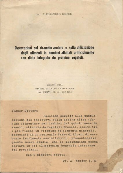 Fascicolo degli anni '30 in stato discreto, coperta in carta con vari segni del tempo, su piatto anteriore incollato foglietto editoriale, pagine in buono stato. Estratto dalla Rivista di Clinica Pediatrica Vol. XXXVI - N. 11 - 1938. Numero Pagine 32