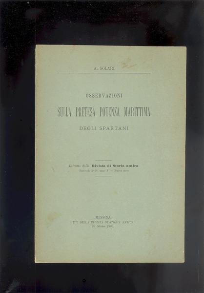 IN 8, pp.29, COPERTINA EDITORIALE IN BROSSURA CON TITOLO. DISSERTAZIONE DA CUI SI RICAVA CHE GLI SPARTANI NON EBBERO MAI UNA VERA POTENZA MARITTIMA, NEANCHE QUANDO ESSI CREDEVANO DI AVERLA CONSEGUITA E DI ESSERSI SOSTITUITI AGLI ATENIESI. ESTRATTO DALLA RIVISTA DI STORIA ANTICA, FASCICOLO 2°-3°, ANNO V - NUOVA<BR>SERIE. OTTIMA CONSERVAZIUONE. ID 4256
