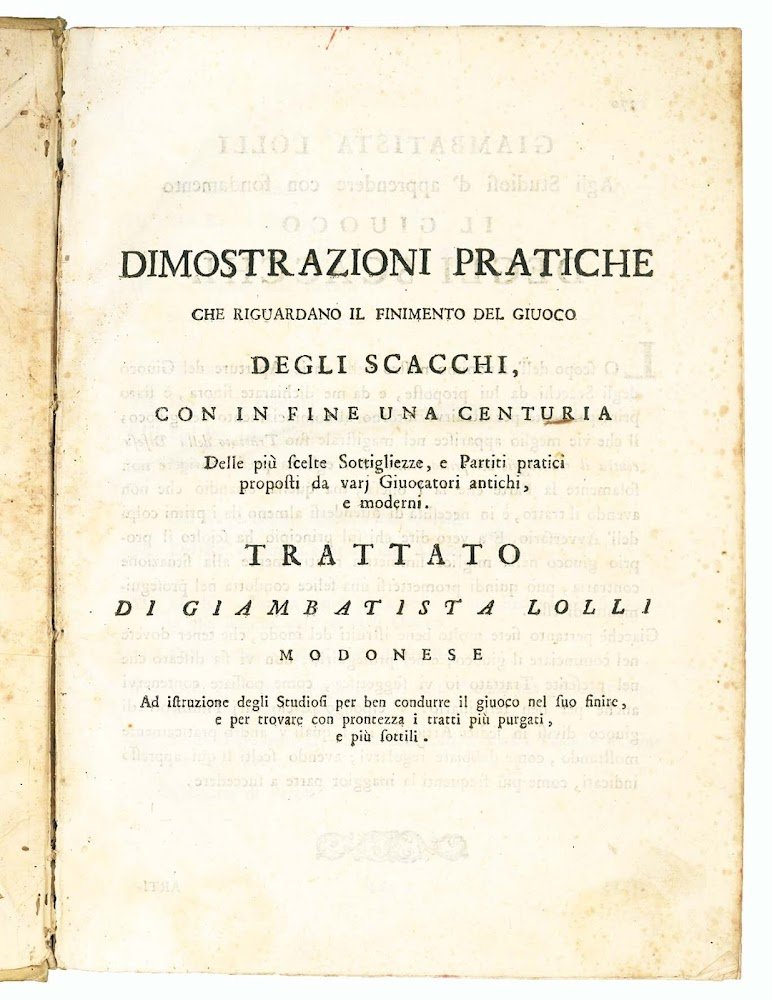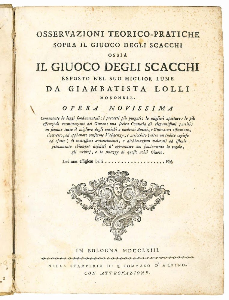 Osservazioni teorico-pratiche sopra il giuoco degli scacchi, ossia Il giuoco degli scacchi esposto nel suo miglior lume da Giambatista Lolli modonese. Opera novissima contenente le leggi fondamentali: i precetti più purgati: le migliori aperture: [...]