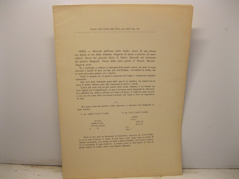 Ostia. Ricerche nell'area delle tombe. Scavo di una stanza con dipinti in via della Fontana. Scoperta di nuove scholae di navicellarii. Sterro del Piazzale dietro il Teatro. Ricerche nel sottosuolo dei quattro tempietti. Pianta dello scavo presso il piccolo mercato. Scoperte varie