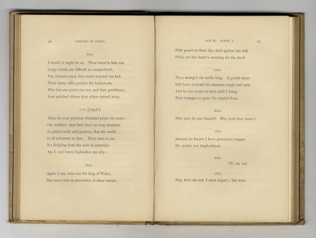 London, Longmans, Green, and Co., 1867, in-8 piccolo, legatura editoriale in piena tela (bianco avorio, leggermente scurita), fregio circolare in oro al centro del piatto anteriore, titolo e filetti in oro al dorso, tagli dorati, pp. [4], 154. Prima edizione di questo testo ambientato nell'alto medioevo inglese.