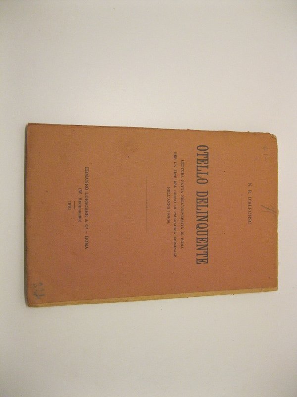 In 16, pp. 51 + (1b). Br. ed. Saggio di criminologia che analizza il personaggio di Otello in chiave psicologica.