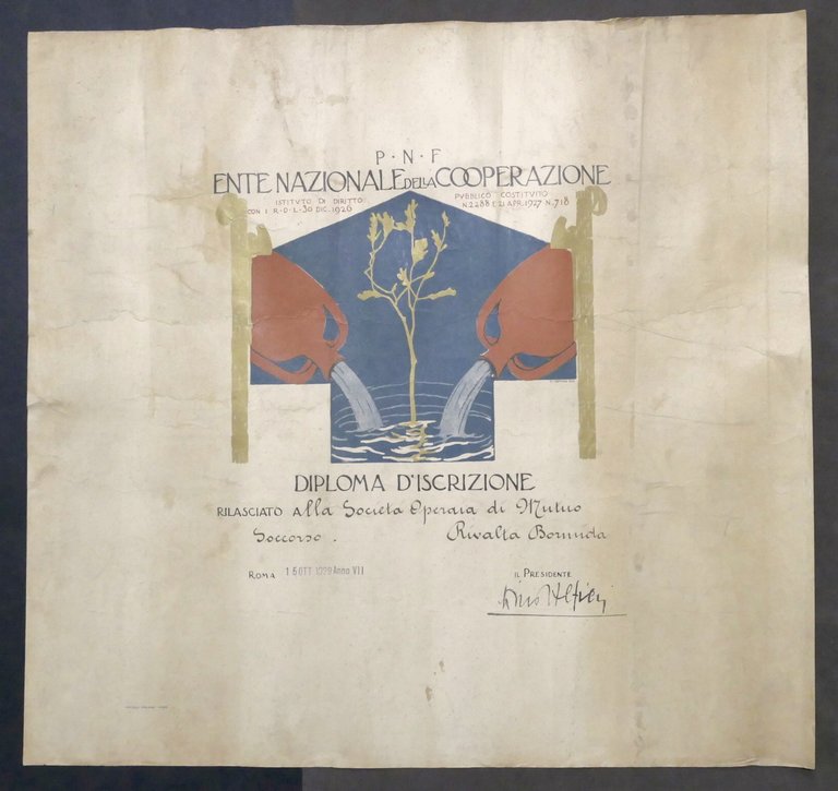 P.N.F. - Ente Nazionale di Cooperazione - Diploma d'iscrizione - Anno 1929