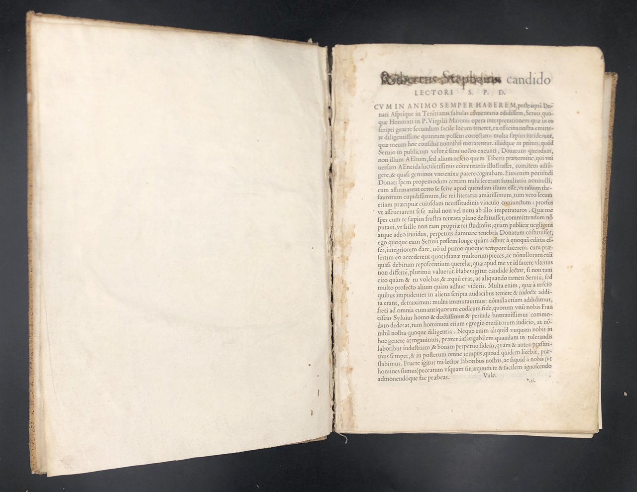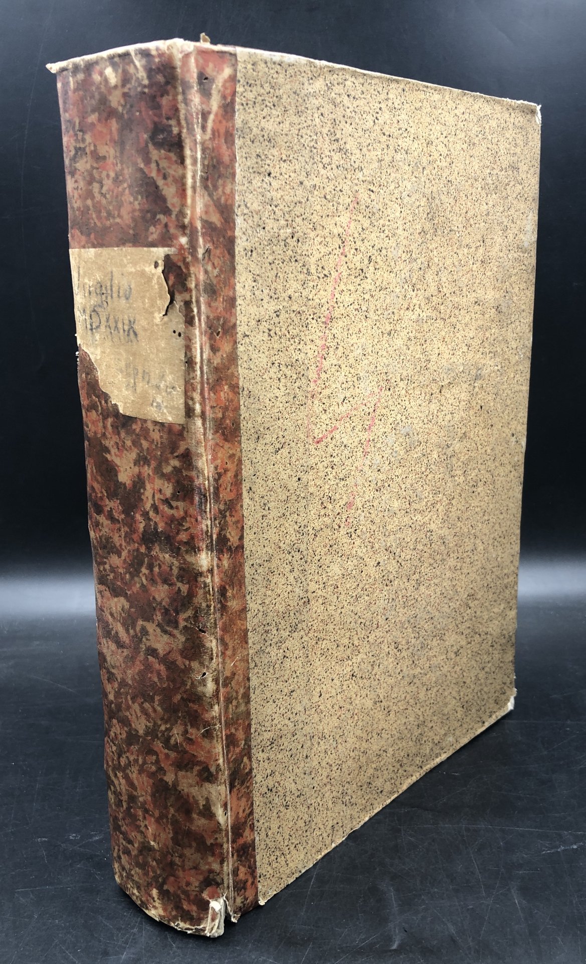 In-folio antico (cm. 29,7x20,8), pp. (10) su (12): MANCA il frontespizio. Pp. 1-144, poi MANCANO le pp. 145-156 (delle Georgiche); seguono le pp. 157-707, (1b) + Index eorum quae in his commentariis a Servio exponuntur. pp. (57), (1). Prima dell'Errata: "Excudebat Rob. Stephanus Parisiis, anno M. D. XXXII XVII Cal. Augusti". Buchetti che diventano brevi gallerie di tarlo (da 1 cm. a 5 cm., senza perdite di stampato) al margine interno delle pp. 161-238, e, insignificanti minuti buchetti ai margini interni degli ultimi fogli. Ombra di antichi petali a 4 pp. Conserva i 5 robusti nervi di cucitura originali, ma è allentato in alcuni punti da p. 527 in poi; il primo foglio e l'ultimo quaderno sono staccati. Traccia lieve di gora marginale a 4 carte all'inizio, ma il resto è pulito in carta forte immacolata e croccante. Il nome dell'insigne stampatore in testa all'indirizzo al lettore è censurato con antichi scarabocchi a penna (fu tacciato di eresia dai teologi della Sorbonne !). Pochissime scritte coeve a margine. Sottolineature coeve a penna a "Octavii Augusti in Virgilii Aeneidem versus". Legatura in cartone, antica ma posticcia, staccata alle cerniere interne, da rifare. Contiene 1) La vita di Virgilio per Aelium Donatum edita". 2) BUCOLICA. 3) GEORGICA. 4) AENEIDOS. Attenzione: MANCA la parte 2.a, "Castigationes et varietates Virgilianae lectionis" che era stata unita a questa edizione riutilizzando l'edizione del 1529. Robert ESTIENNE (Parigi 1503 - Ginevra 1559), già nel 1526 possedeva una propria tipografia. Versatissimo in latino, greco, ebraico, fu instancabile nel propagare in Francia i monumenti letterari dell'antichità greco-latina. Claude Garamond incise per lui i suoi celebri caratteri greci e il re Francesco I lo nominò nel 1539-40 "tipografo regio". Pubblicò oltre 40 edizioni critiche di classici latini curate da lui stesso e varie grammatiche e lessici. Così com'è, mutilo della seconda parte (Castigationes), del frontespizio e di 12 pagine delle Georgiche