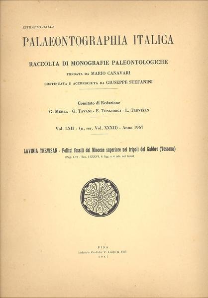 IN 4°,pp.78 + XXXVI TAVV.f.t. TUTTE CON VELINE DI PROTEZIONE,8 figg. e 4 tab. NEL TESTO.<BR>E' IL VOL. LXII - ( n.ser.VOL.XXXII ) - ANNO 1967. IL VOL. CONTIENE LA MEMORIA DI LAVINIA<BR>TREVISAN SUI : POLLINI FOSSILI DEL MIOCENE SUPERIORE NEL TRIPOLI DEL GABBRO<BR>( TOSCANA ),COPERTINA EDITORIALE CON TITOLI. PRESTIGIOSA MONOGRAFIA PALEONTOLOGICA IL CUI COMITATO DI REDAZIONE E' COMPOSTO DA G.MERLA - G.TAVANI -<BR>E.TONGIORGI - L.TREVISAN. STATO NUOVOID ID 1111